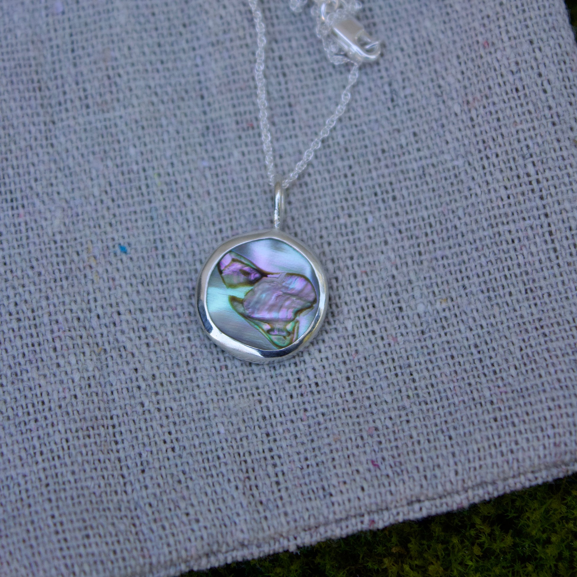 Simple round abalone pendant set in .925 sterling silver. Hangs on a 16 inch sterling silver chain. Lightweight, elegant and perfect for everyday wear.