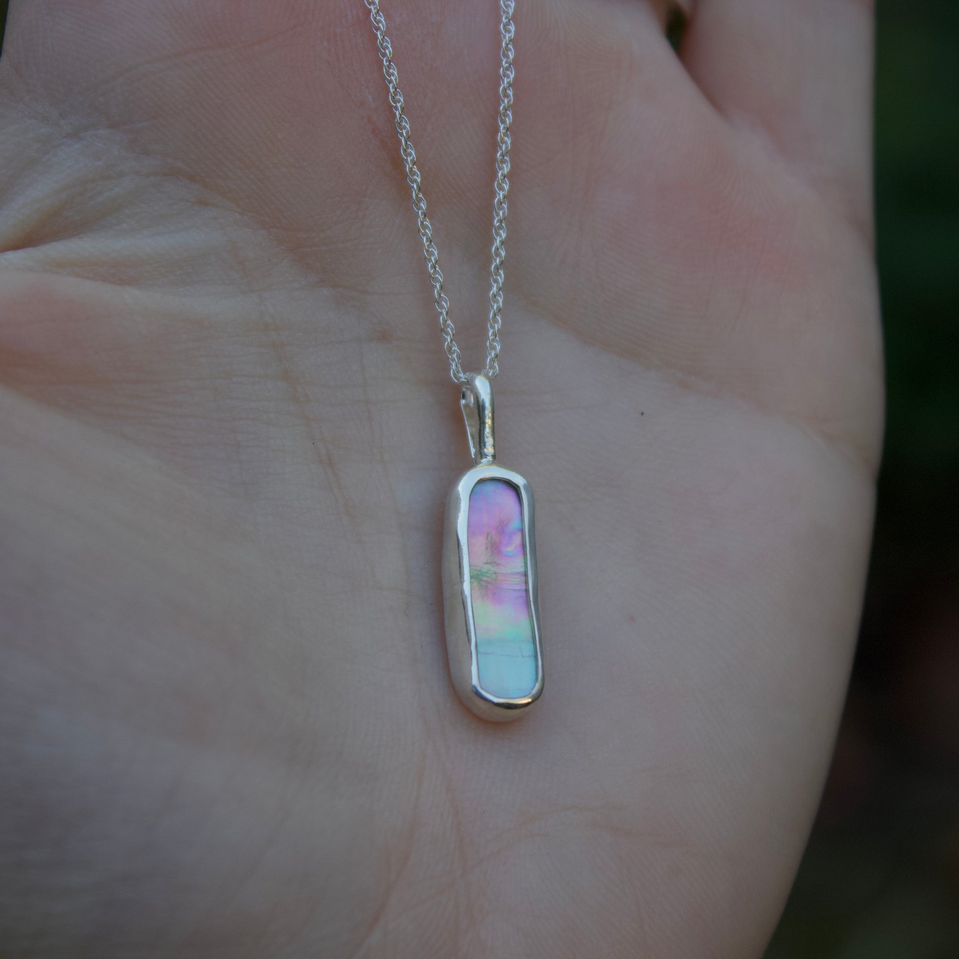 Simple iridescent abalone pendant set in .925 sterling silver. Hangs on a 16 inch sterling silver chain. Lightweight, elegant and perfect for everyday wear.