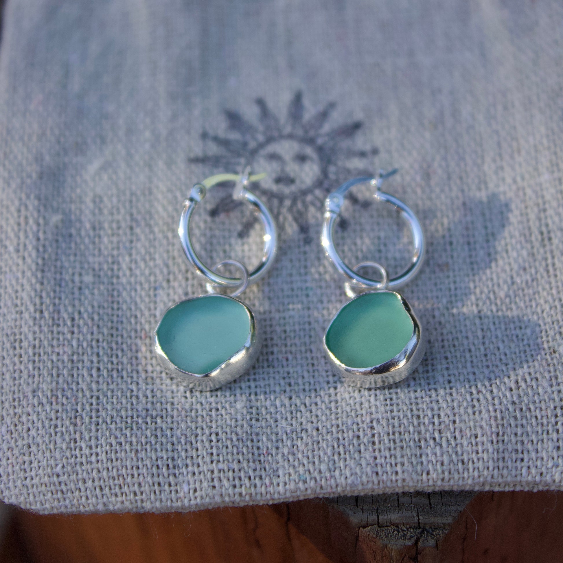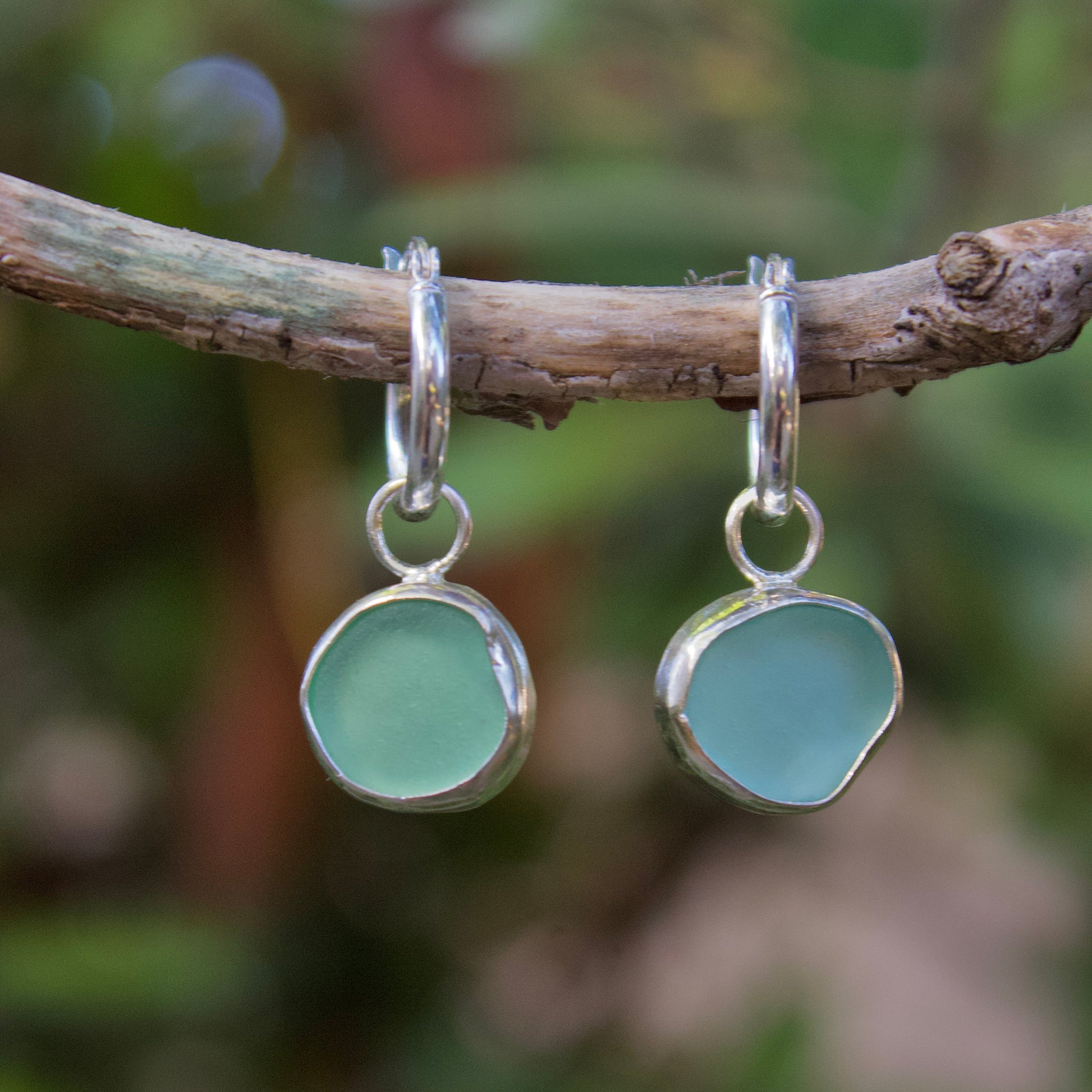 Simple and versatile hoop earrings with bezel-set pale green and baby blue sea glass pendant. Made entirely with .925 sterling silver, these earrings are light weight, minimal and delicate for everyday wear or statement piece.