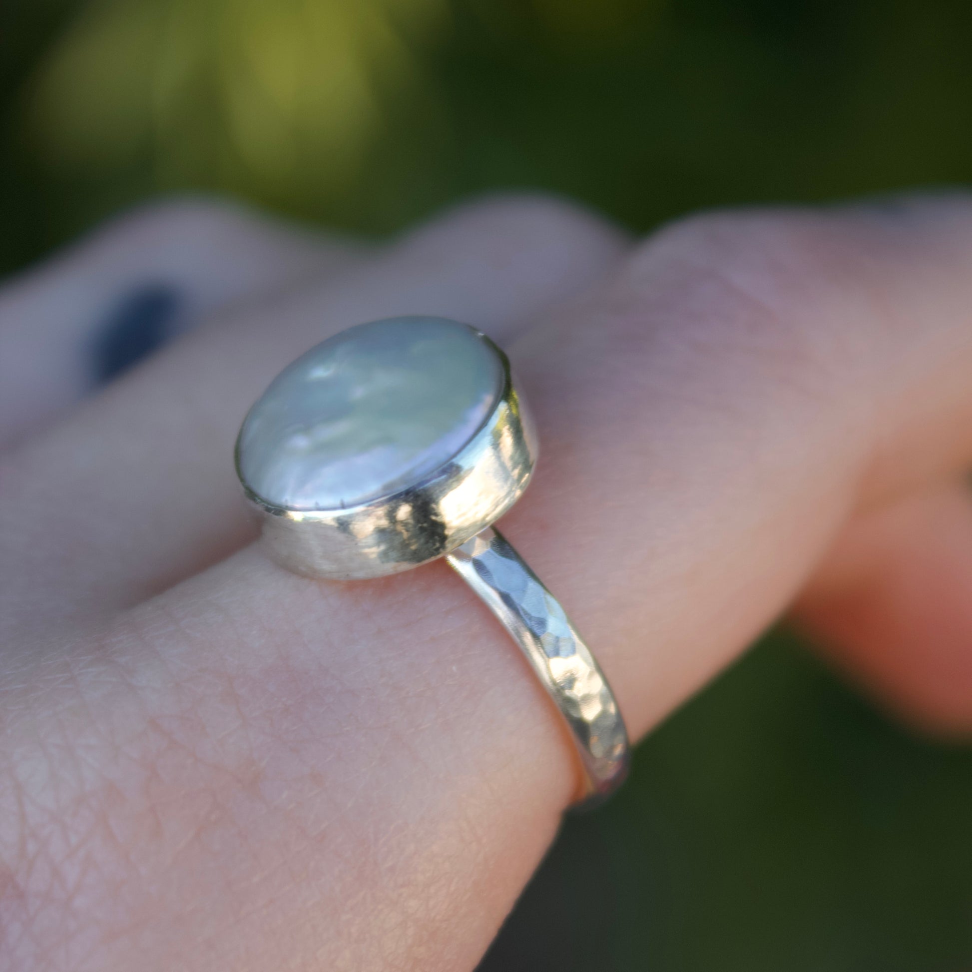 This statement ring is entirely handcrafted in .925 sterling silver and features an authentic iridescent white freshwater pearl and is set on a simple hammered band. Size US 7.5.