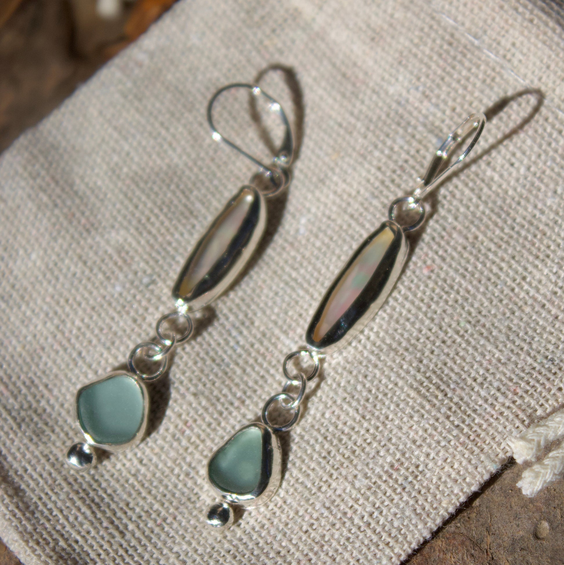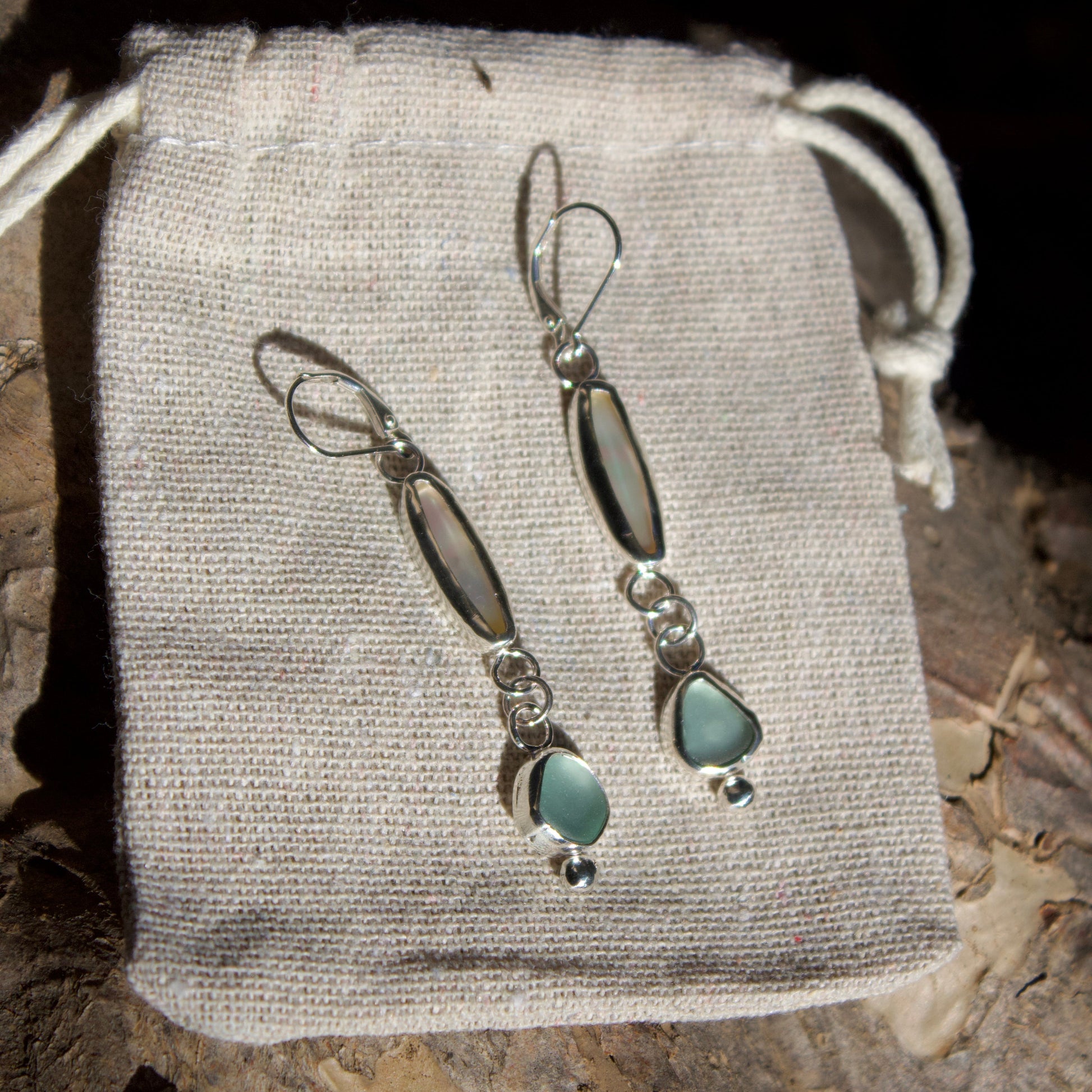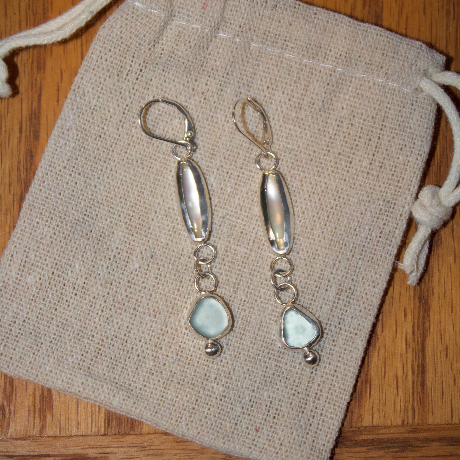 These handmade .925 sterling silver dangly earrings feature a stunning duo of natural elements- an elongated mother of pearl bezel that catches the light with a soft, iridescent glow, paired with a bezel-set piece of pale blue sea glass.