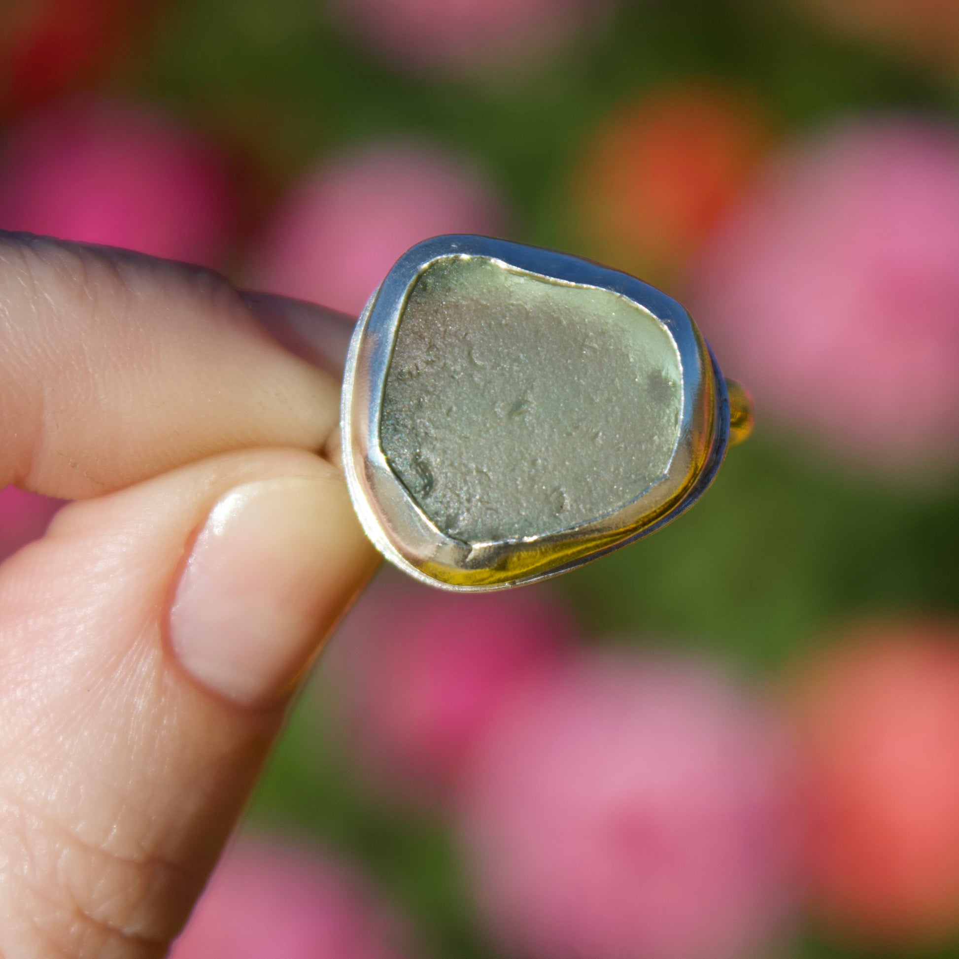 Handcrafted sterling silver ring with a pale green sea glass. The back of the setting is left open, allowing natural light to pass through, creating a bright and airy design. US size 6.5