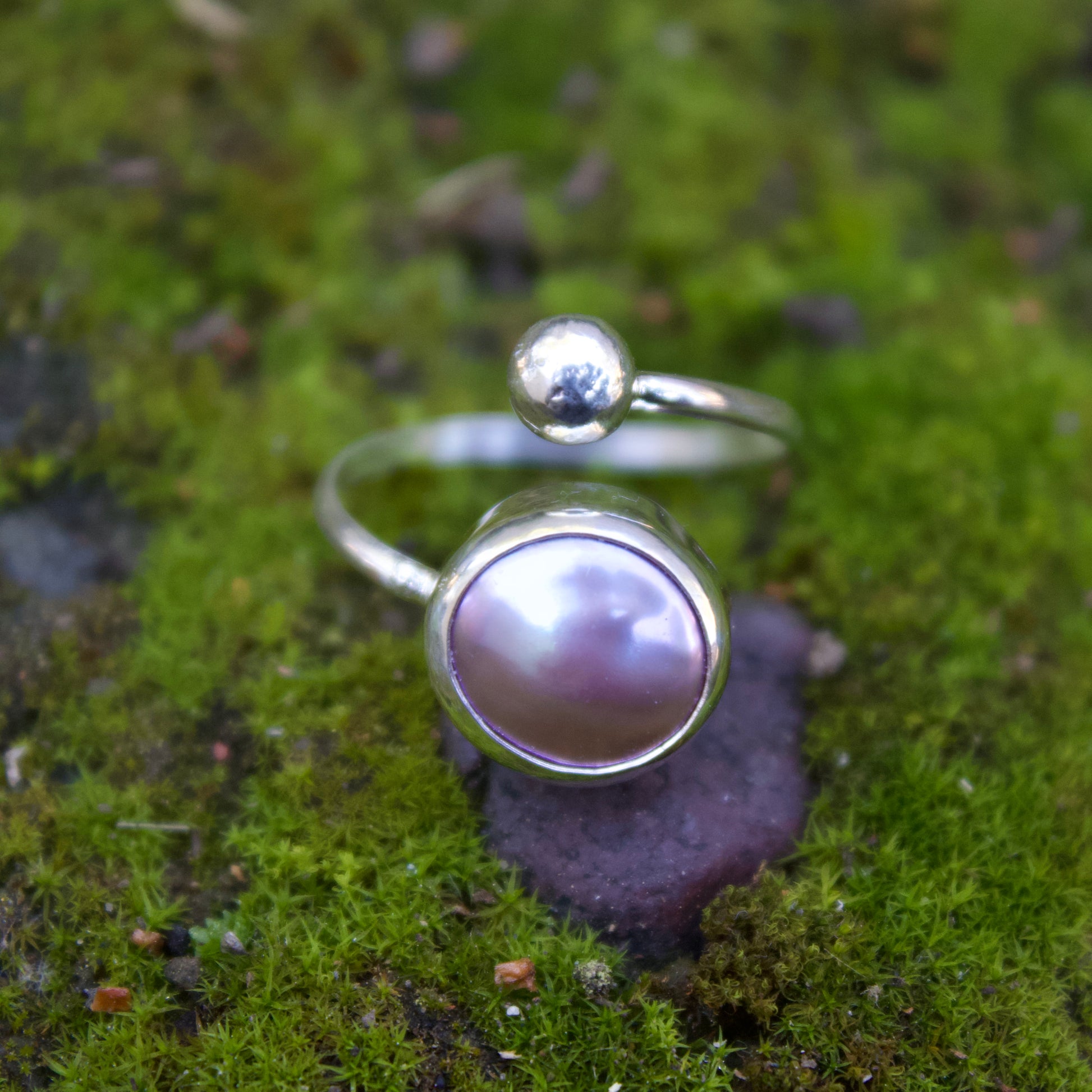 Handcrafted entirely in .925 sterling silver, this swirl ring features an authentic pink freshwater pearl on one end and a small silver dome on the other. Its open design makes it adjustable and easy to wear.
