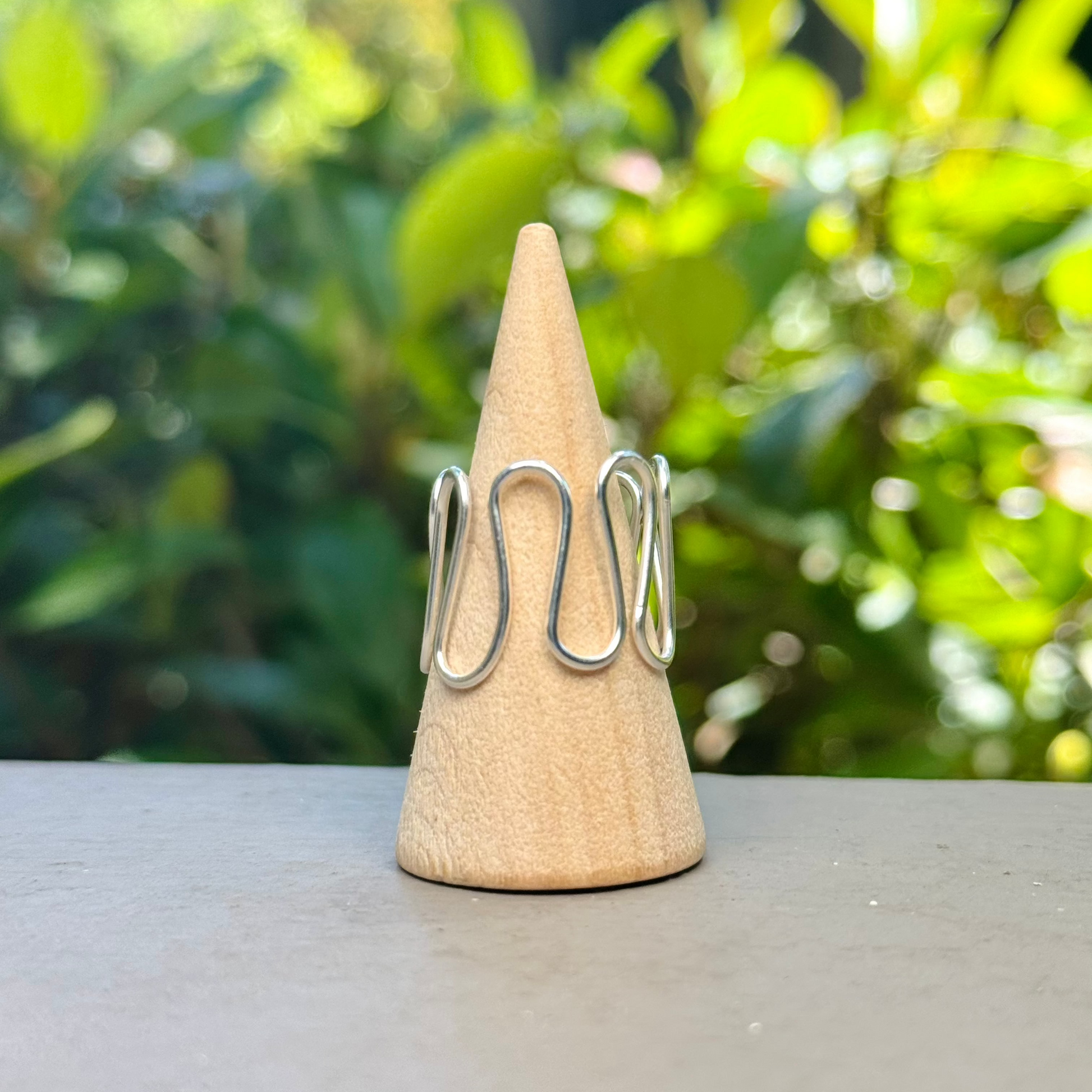 This handcrafted ring is made with 925 sterling silver wire, featuring a turquoise color sea glass bezel-set at the center. Made with a soft version of sterling silver wire, the unique wavy design adapts gently to different finger sizes for an adjustable fit. (Sizes recommended US 5, 6, 7)